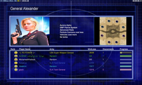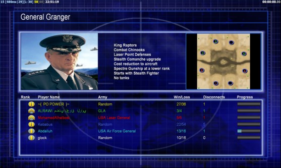 | Name | Side | Color | Team | Starting Position | Buildings Built | Buildings Lost | Buildings Destroyed | Units Built | Units Lost | Units Destroyed | Money Earned | Outcome |