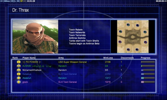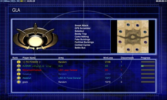 | NameALRAWI مفتي العراق الراوي | Side | Color | Team1 | Starting Position0 | Buildings Built1 | Buildings Lost0 | Buildings Destroyed0 | Units Built4 | Units Lost0 | Units Destroyed0 | Money Earned0 | OutcomeLost |