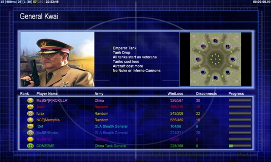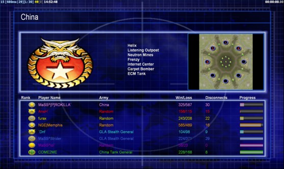 | Name | Side | Color | Team | Starting Position | Buildings Built | Buildings Lost | Buildings Destroyed | Units Built | Units Lost | Units Destroyed | Money Earned | Outcome |